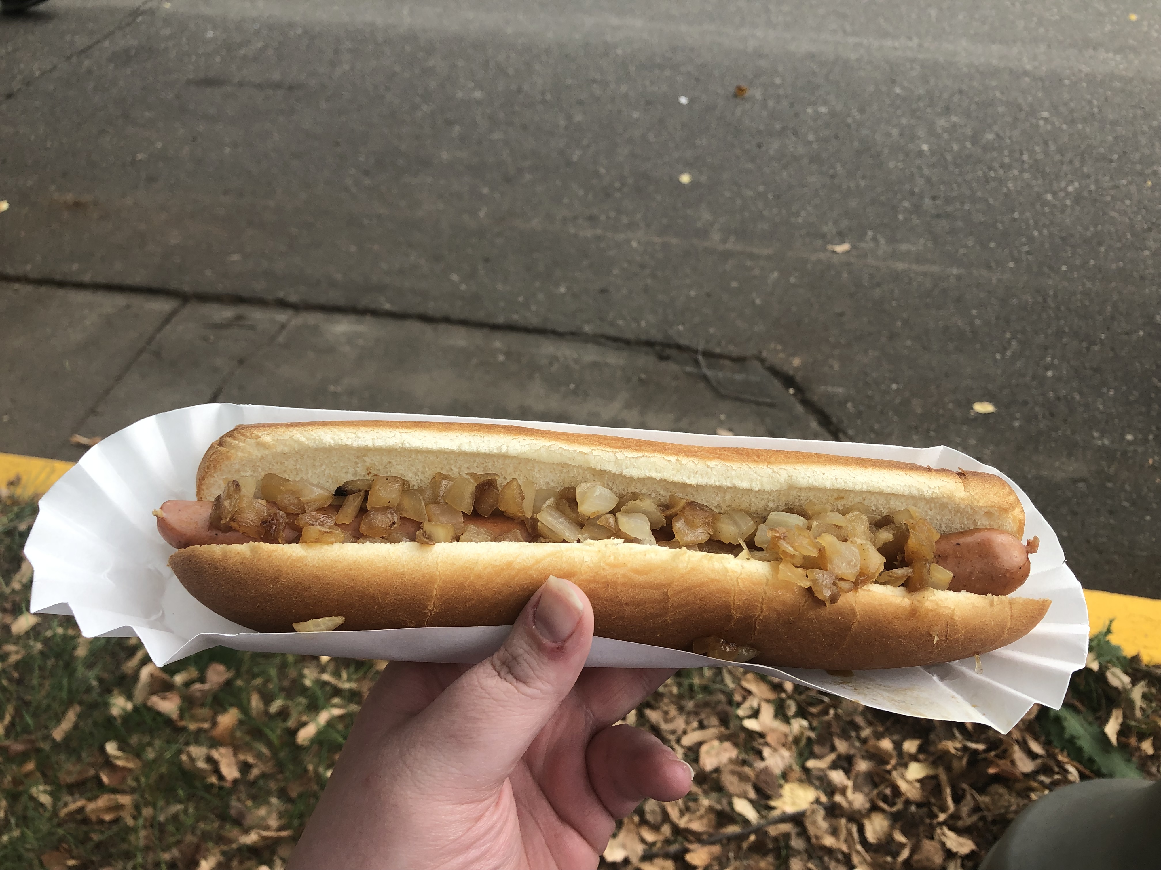 "About A" Foot Long, beef/pork hot dog with grilled onions - $7.00