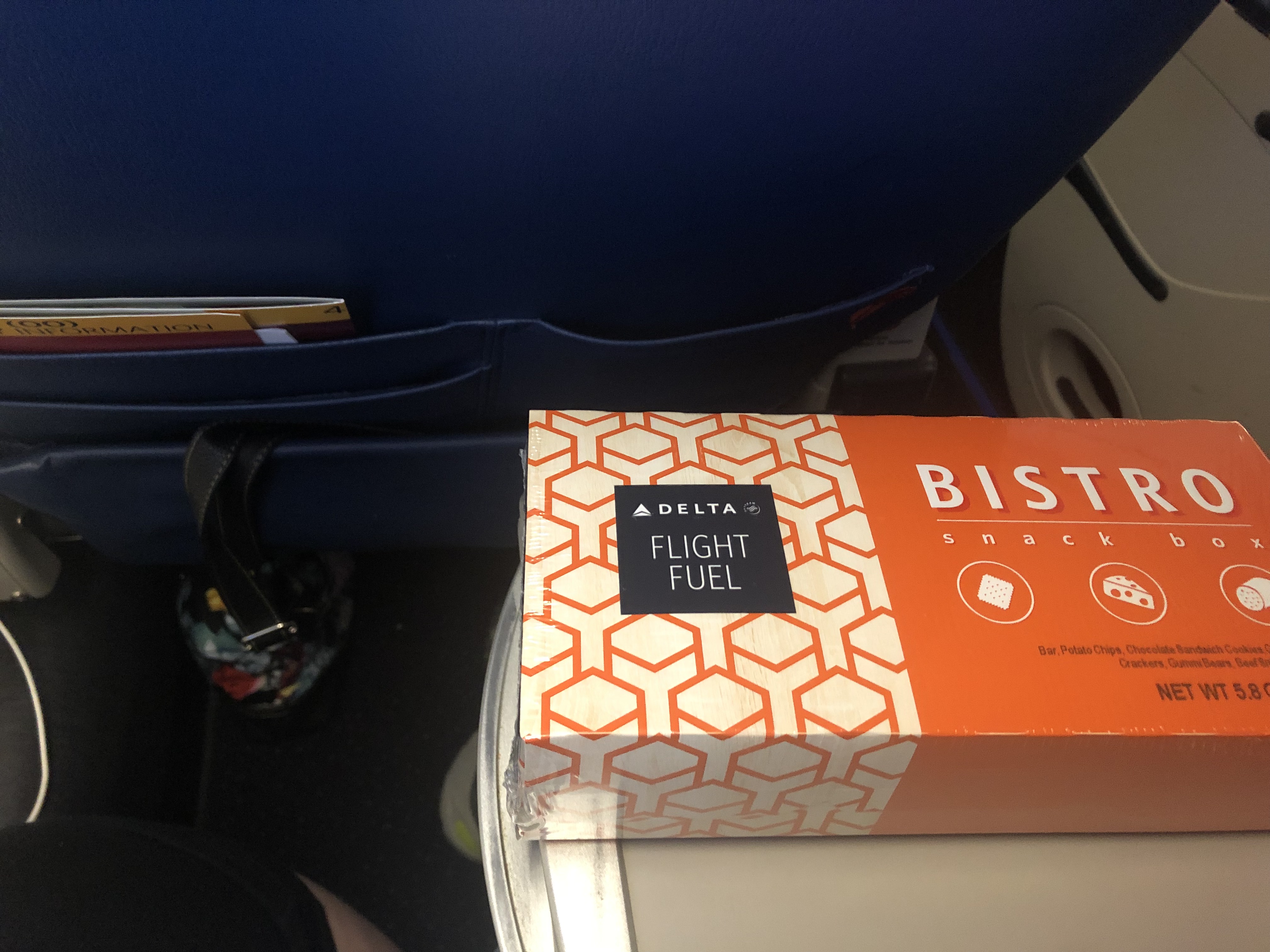 First class "meal" on the way to Minneapolis: Diet Coke, salted almonds, Rx Bar, Mozaics veggie chips, That's It fruit bar, beef jerky, dark chocolate, Mentos (not pictured)