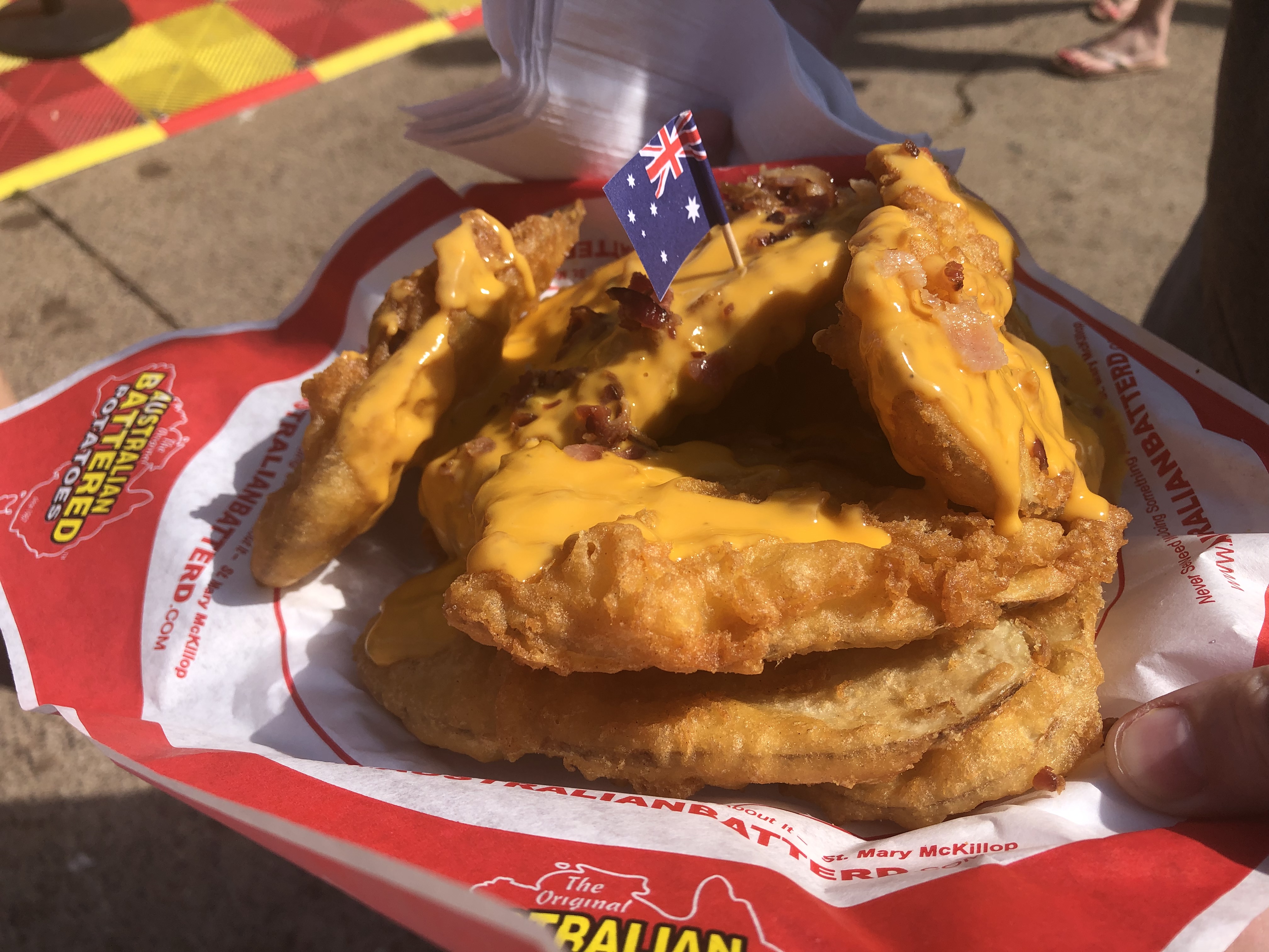 Australian Battered Potatoes - cheese and bacon - $14.00