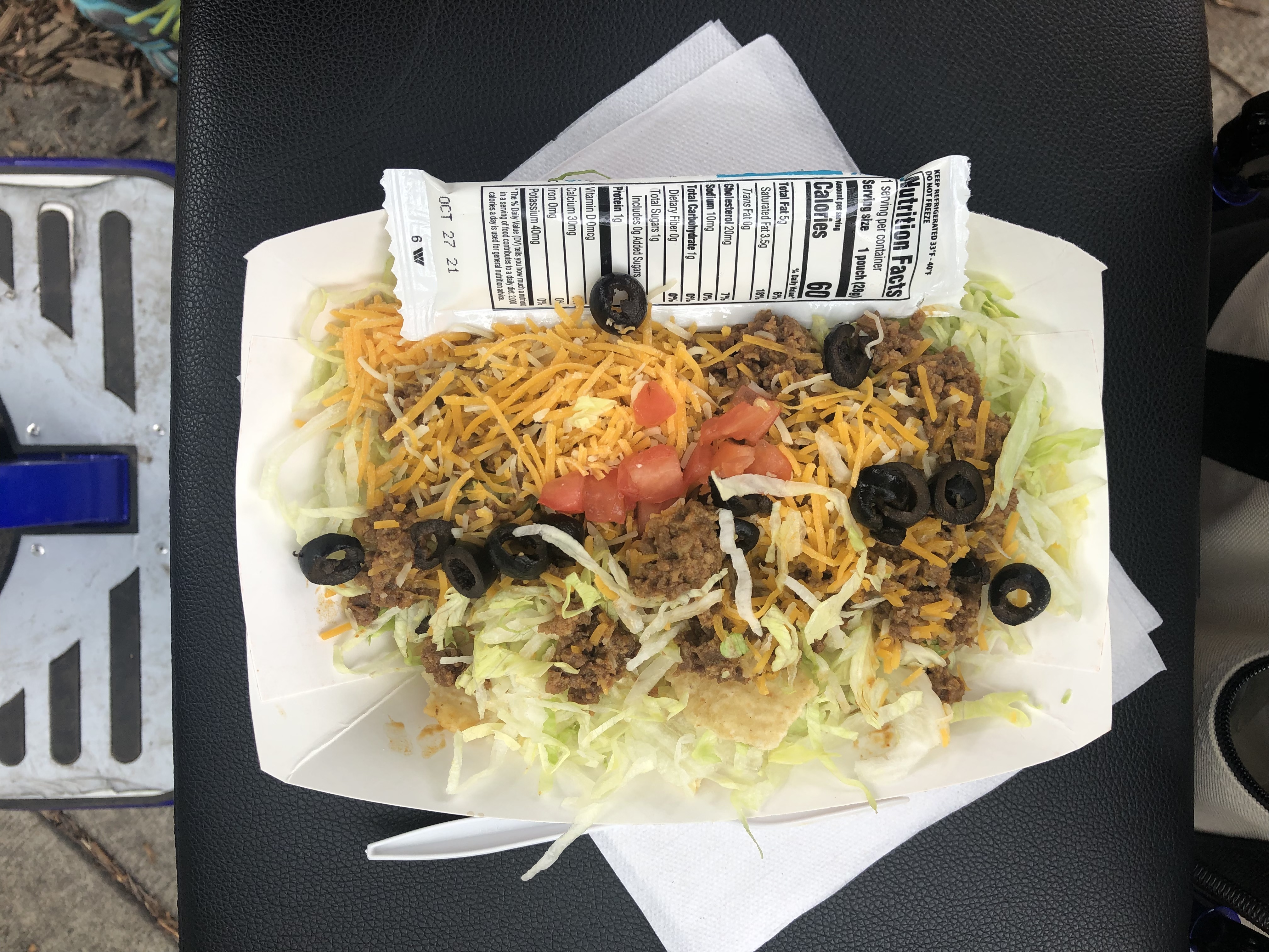 Mexican Hat: beef taco salad (tomato, cheese, black olives, sour cream, shredded lettuce over round white corn tortilla chips) - $9.00