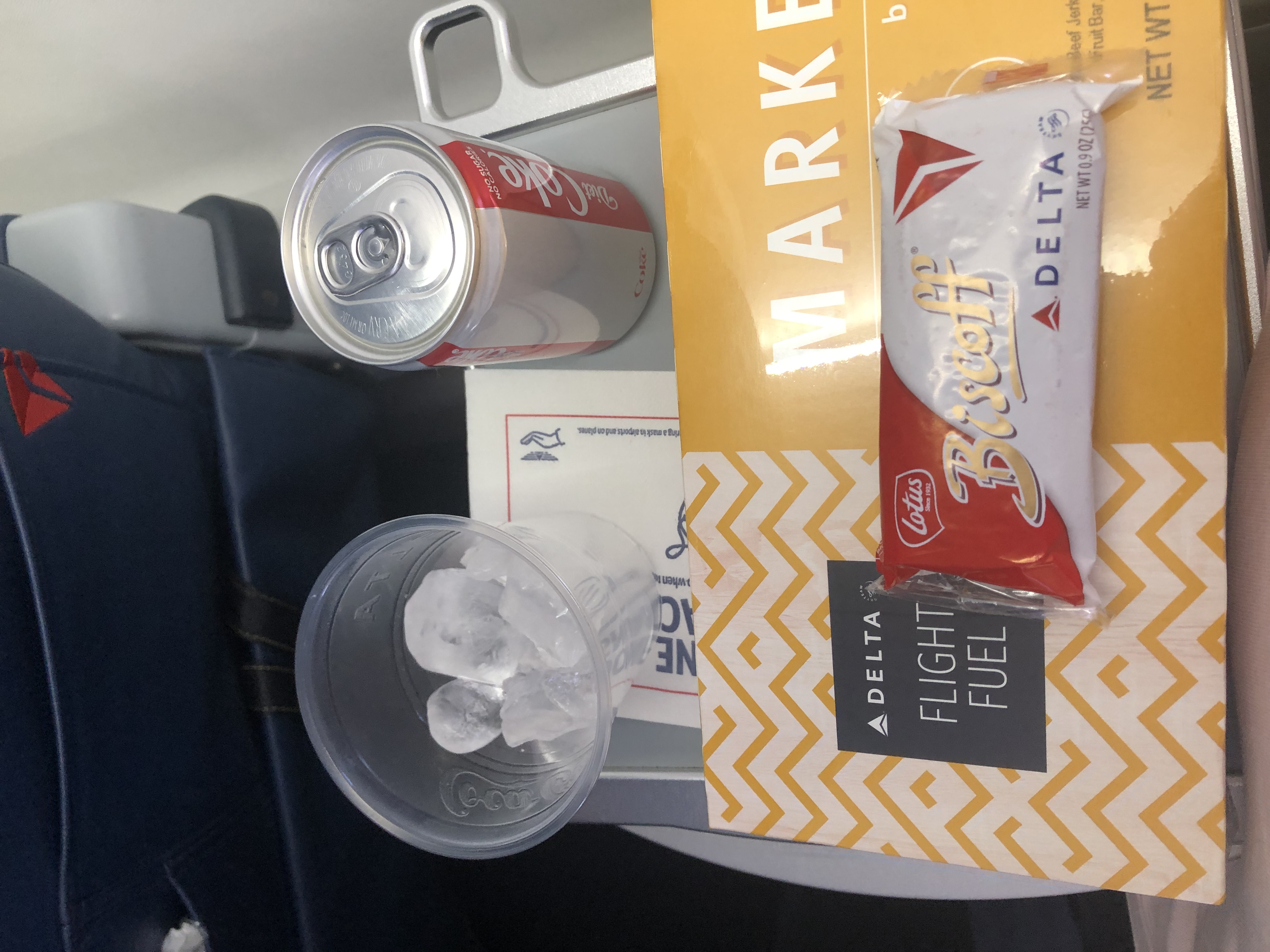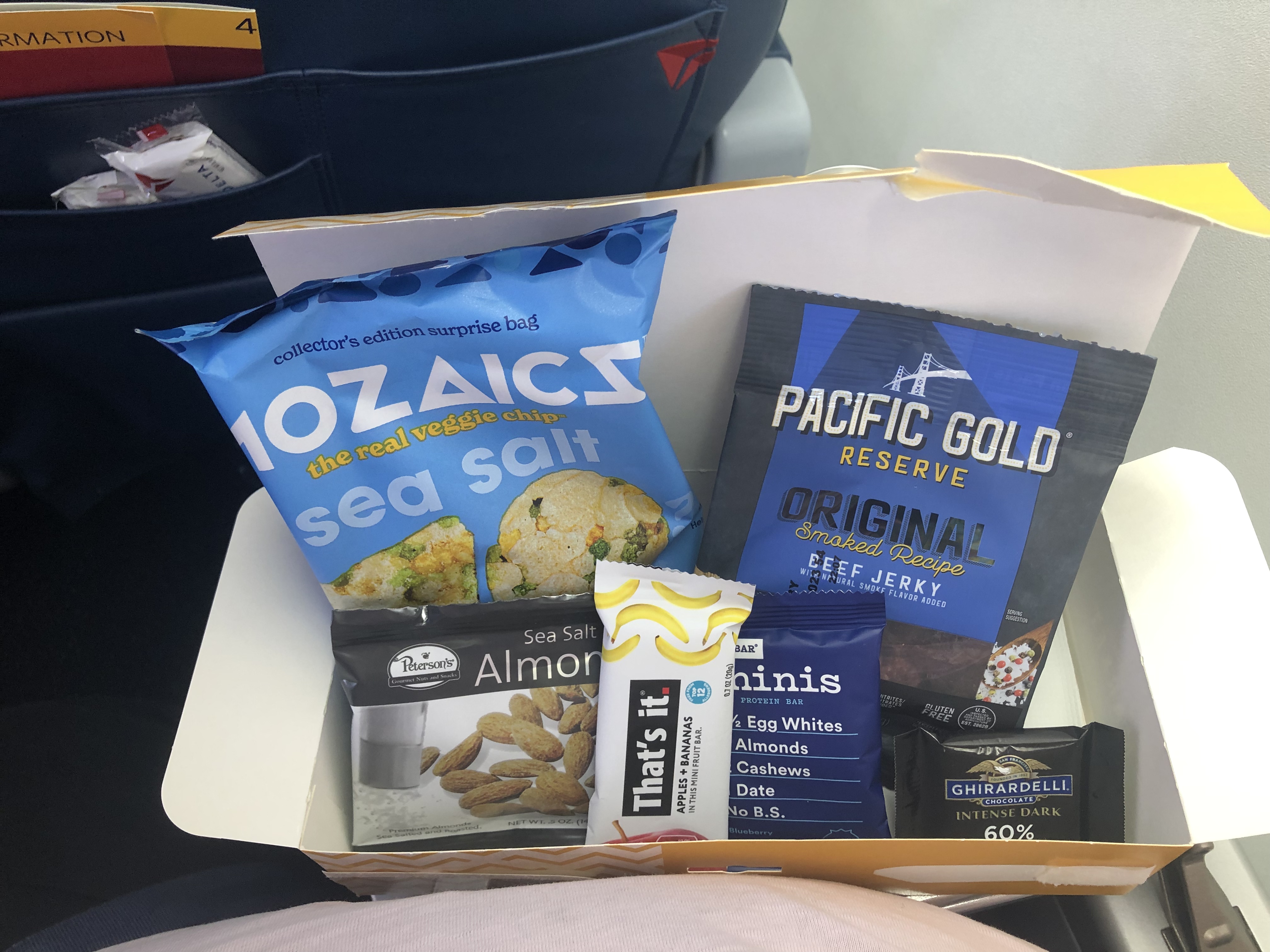 First class "meal" on the way to Minneapolis: Diet Coke, salted almonds, Rx Bar, Mozaics veggie chips, That's It fruit bar, beef jerky, dark chocolate, Mentos (not pictured)