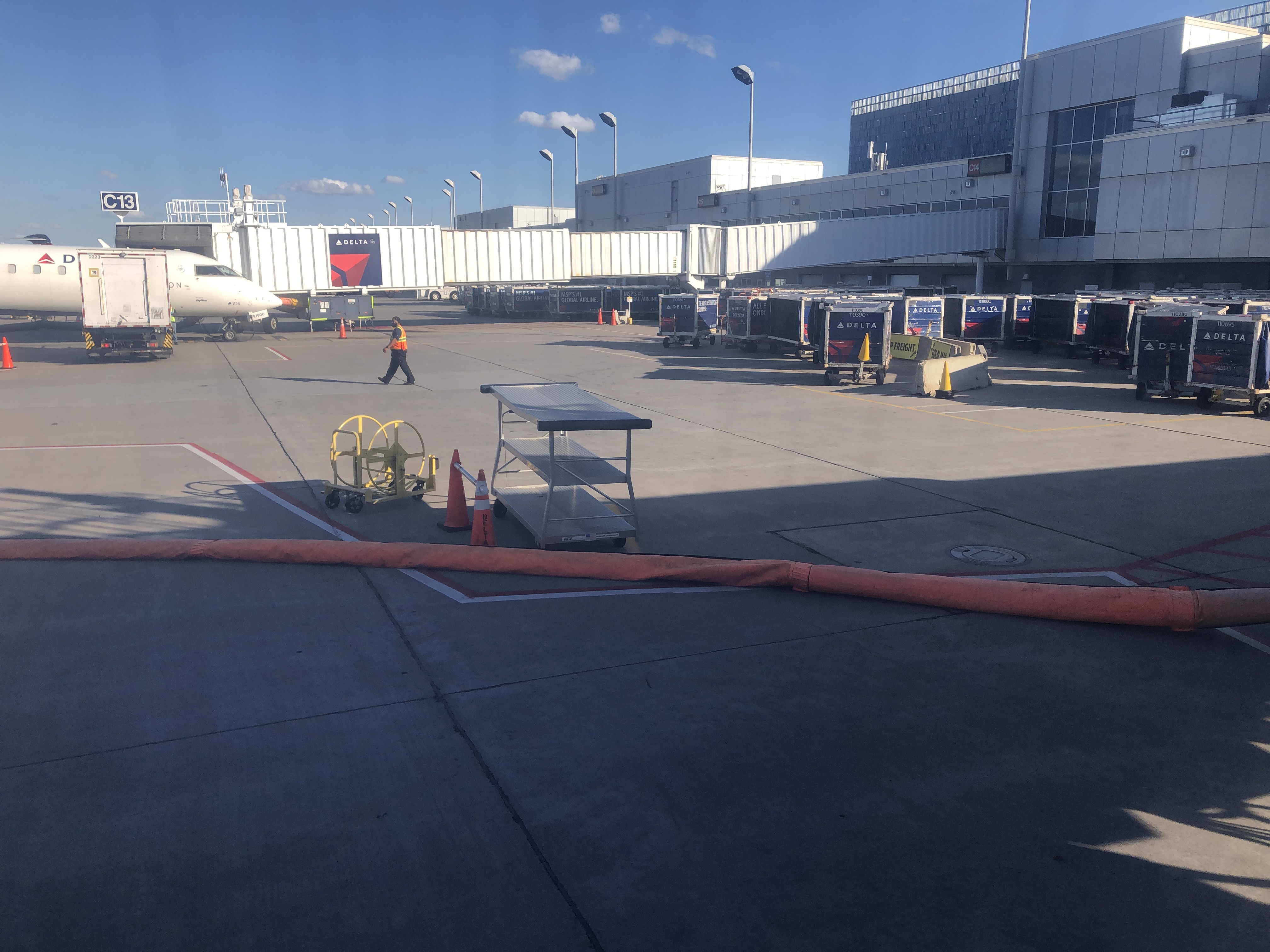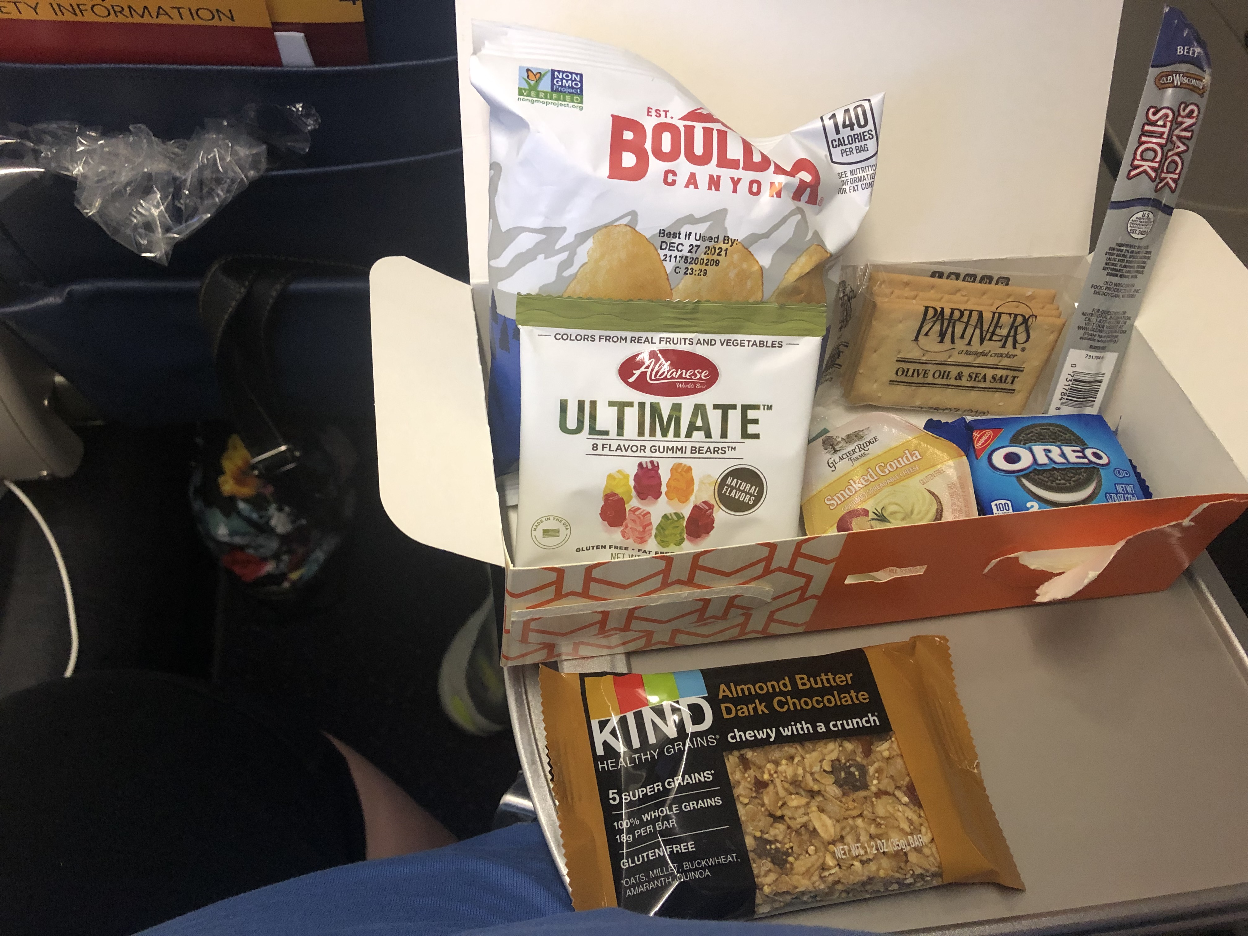First class "meal" on the way to Charlotte: kettle potato chips, gummy bears, crackers, smoked Gouda cheese, meat stick, Kind bar, Oreo cookies, TicTacs (not pictured)